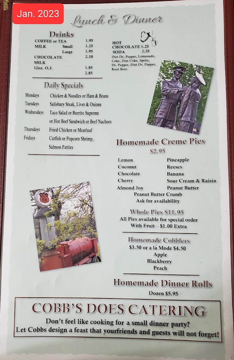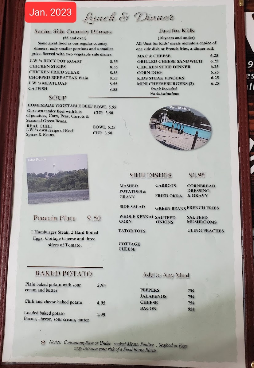 “ We love JW Cobbs for the great food, the homey atmosphere, and the people. The staff are so friendly. We stop and eat here every time we are in Ponca City. It's always a part of our trip. And, we always get a slice of pie to go. ”